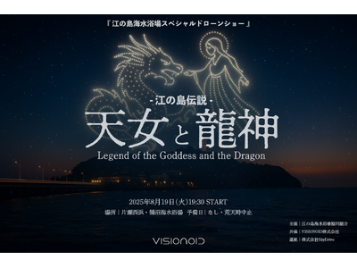 本ドローンショーは、江の島海水浴場協同組合とVISIONOID株式会社(東京都港区、代表取締役:竹中悠満)が連携し、江の島に語り継がれる「天女と龍神」の神話をテーマに、夜空に壮大なストーリーを演出し、SkyDriveが運航を担当します。