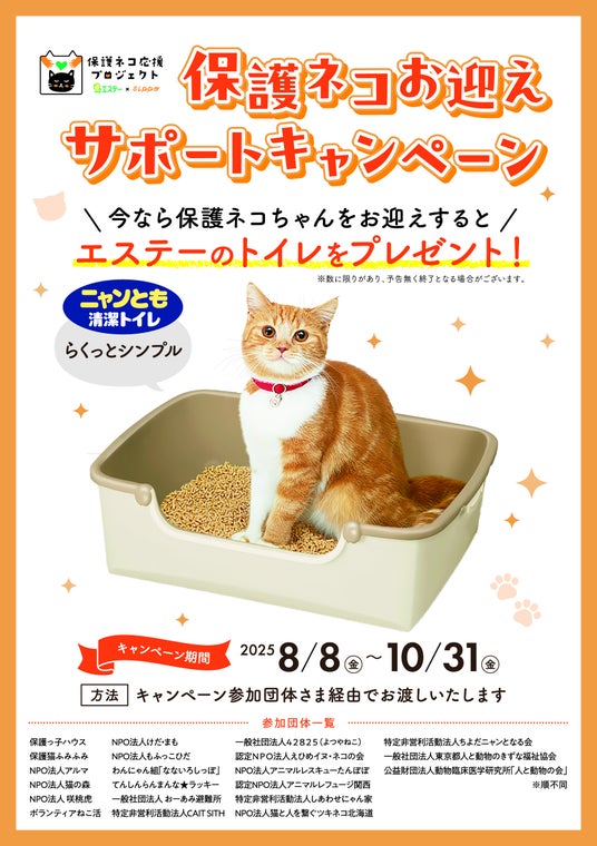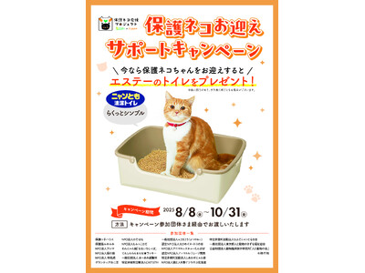 エステー株式会社(以下、「エステー」)は、保護猫や保護猫団体を支援する「保護ネコ応援プロジェクト」の一環として、保護団体から保護猫をトライアルで迎える方に猫用システムトイレ「ニャンとも清潔トイレ らくっとシンプル」をプレゼントする「保護ネコお迎えサポートキャンペーン」を実施します。