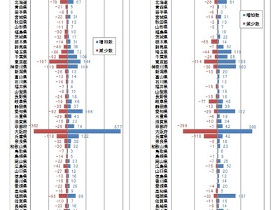 訪問介護は都道府県により増減数の多寡のばらつきが見られ、概ね増加数と減少数が対になっているが、地方部では減少数、都市部では増加数が上回る傾向が見られる。大阪府は突出した増加数で減少数を大きく上回っている。要因の一つとして、近年訪問介護を併設した低廉な住宅型が急増、強い関連性がうかがわれる。また、東京都は減少数が増加数を上回っているが、これは(株)アースサポートや(株)ニチイ学館、SOMPOケア(株)等の大手運営事業者で減少が見られたことも影響している。