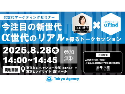 セミナーでは、 「あんふぁん」編集長・白石晴子が登壇。東急エージェンシー「αFind(アルファインド)」(※2)メンバーの方々とともに、親の視点も交え、α世代の特徴を深掘るトークセッションを行います。また後半は、月刊トイジャーナル編集長の藤井大祐氏が、次世代に向けた玩具のトレンドや玩具市場の今後の展望について講演。α世代を対象としたマーケティングの本質に迫ります。参加無料。ご興味のある方はお気軽にご参加ください。