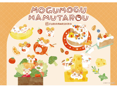 ハム太郎たちがフルーツや野菜、チーズやケーキを幸せそうに”もぐもぐ”食べる姿にほっこり癒される古川紙工描きおこしのデザインです!