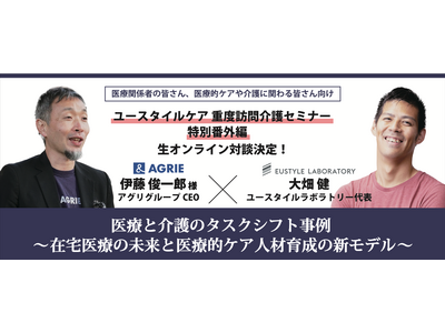 9月は、「ユースタイルケア重度訪問介護セミナー」特別番外編として、アグリグループ CEO 伊藤 俊一郎様をお招きし、ユースタイルラボラトリー 代表 大畑 健と、対談形式でライブ配信します。