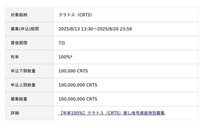 ■【年率100%】クラトス(CRTS)貸し暗号資産特別募集
