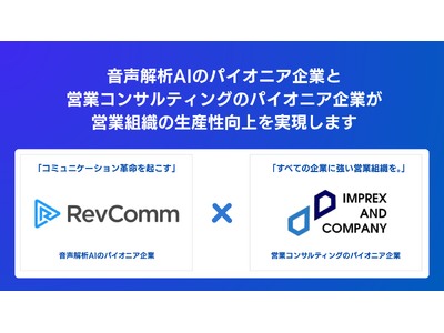 営業コンサルティング・アウトソーシング事業を展開するインプレックスアンドカンパニー株式会社(本社:東京都港区、代表取締役:伊藤 勝成、以下 インプレックスアンドカンパニー)と、AI搭載型クラウドIP電話「MiiTel(ミーテル)」を提供する株式会社RevComm(本社:東京都渋谷区、代表取締役:會田 武史、以下 レブコム)は、営業領域におけるDX推進と企業の事業成長支援を目的とした戦略的業務提携を締結したことをお知らせいたします。