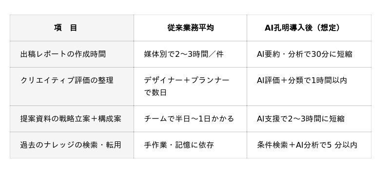 出稿データの分析や効果検証、クリエイティブ制作・評価、報告書作成など膨大なオペレーションが発生する一方で、「属人的な経験」「個人の勘」に依存した意思決定が多く、業務の標準化や効率化には限界がありました。
