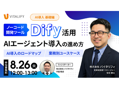 生成AIを活用したSaaSサービスの提供を行う株式会社バイタリフィ(東京都渋谷区、代表取締役:板羽晃司)は2025年8月26日(火)12:00に「【無料オンラインセミナー】Dify活用、AIエージェント導入の進め方」を開催致します。