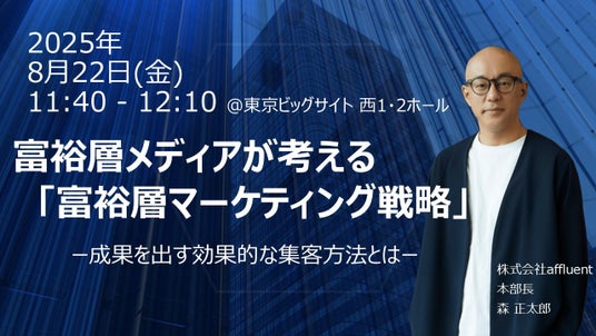 株式会社affluent(東京都港区、代表取締役社長:高山勇樹)は、2025年8月21日(木)・22日(金)に東京ビッグサイト 西1・2ホール(東京都江東区有明)で開催される「第4回 営業・マーケDEXPO東京 ’25 夏」にブースを出展、セミナーを開催いたします。