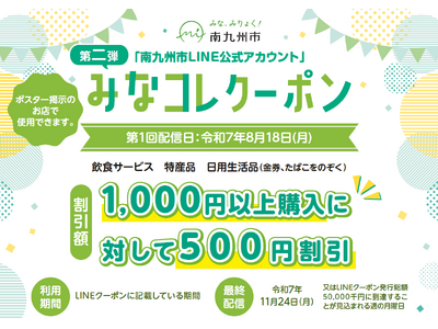 みなコレクーポンとは、南九州市内の参加事業者でご利用いただける、南九州市独自のLINEクーポンです。