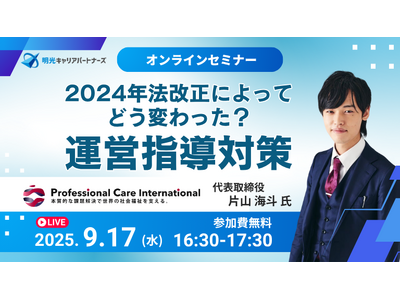 株式会社明光キャリアパートナーズ(代表取締役:小西 悠太)は、2025年9月17日(水)に「2024年法改正によってどう変わった?運営指導対策 」オンラインセミナーをProfessional Care International株式会社と共同開催いたします。