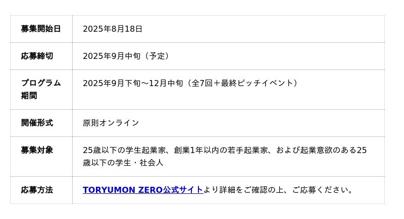 プレシード期スタートアップに投資を行うベンチャーキャピタル、F Ventures(代表パートナー:両角 将太)は、25歳以下の学生起業家・若手起業家を対象とした実践型インキュベーションプログラム「TORYUMON ZERO supported by First Followers」の新規メンバー募集を2025年8月18日より開始します。本プログラムは、アイデア段階の事業創出から資金調達、チームビルディングまで、若手起業家の挑戦を一貫してサポートします。