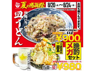 夜はパンチの効いた爆盛り野菜炒め、大容量のメガハイボールで最高の夏休みをお過ごしくださいませ。