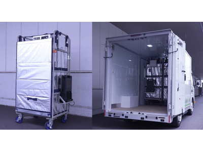 <実証で使用する断熱・保冷機能付きの輸送用機材と小型 EVトラック>