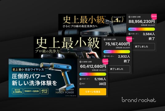 初回から3度にわたり、複数回のMakuake展開をサポート。全プロジェクトがMakuake総合ランキング1位ならびに、歴代ランキングインを達成。現在進行中の「T-PROFESSIONAL HYDRO CLEANER HANDY POWER」においては、プロジェクト2日目にして累計応援総額3000万超えを達成しました。