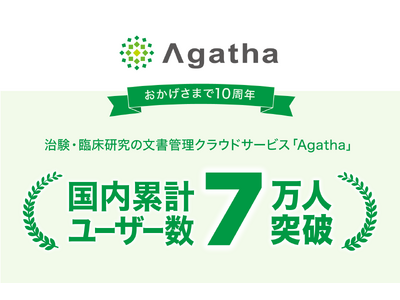 アガサ株式会社(本社:東京都中央区、代表取締役社長:鎌倉千恵美、以下「当社」)は、当社が提供する治験・臨床研究に特化したDXクラウドサービス『Agatha(アガサ)』において、ユーザー数が7万人を突破したことをお知らせいたします。現在、国内で治験を実施する医療機関の約66%(※1)、製薬企業においては約80%のお客様に「Agatha」をご利用いただいております。