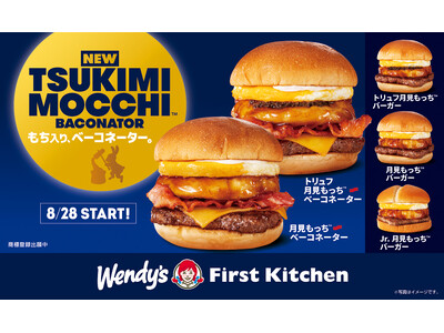 ウェンディーズ・ジャパン株式会社及び、ファーストキッチン株式会社 (所在地:東京都新宿区、代表取締役:紫関修) では、8月28日(木)から、ウェンディーズ・ファーストキッチンとファーストキッチンにて、丸餅をお月様に見立てた独自性バーガー“月見もっち(TM)”シリーズを発売します。“月見もっち(TM)”シリーズは、毎年、ファーストキッチンで秋季限定で販売しており話題となっている商品で、今回、ウェンディーズでも満を持しての登場となります。ウェンディーズではおもちとたまごに、黒トリュフを使用したてりやきソースやカリカリベーコンをあわせ、アメリカンでプレミアムな月見バーガもご用意しました。どちらのブランドも丸餅は店内で揚げ餅にしており、特製てりやきソースと絡めて出来立てを提供します。
