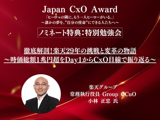 株式会社BNGパートナーズは、この度、当社が主催する「Japan CxO Award」へのノミネート特典として楽天グループ株式会社 常務執行役員 Group CCuO 小林 正忠 氏による特別勉強会が開催決定したことをお知らせいたします。