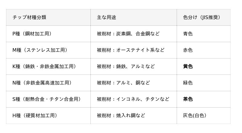 代表的な色分け指針が存在します。これは、工具管理や加工条件の選定を効率化する目的で、現場でも広く活用されています。