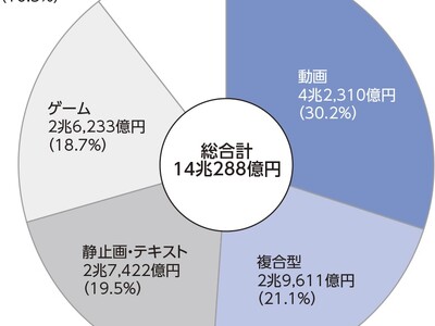 コンテンツ区分別に見ると、規模が大きい順に、動画が4兆2,310億円(前年比99.1%)、複合型が2兆9,611億円(同110.2%)、静止画・テキストが2兆7,422億円(同96.1%)、ゲームが2兆6,233億円(同108.7%)、音楽・音声が1兆4,711億円(同106.6%)。複合型とゲーム、音楽・音声区分が前年から増加した