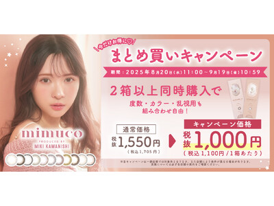 PIA株式会社(本社:東京都品川区 代表取締役:見原 博道)が展開する、YouTubeチャンネル登録者数100万人超えの大人気美容系動画クリエイターかわにしみきプロデュースのカラコンブランド『mimuco(ミムコ)』は、2025年8月20日(水)~9月19日(金)の期間、2箱以上同時購入で1箱あたり1,000円(税抜)で購入できるまとめ買いキャンペーンを実施いたします。