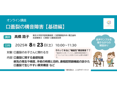 一般社団法人ことばサポートネットは、口蓋裂等による構音障害のあるお子さんに関わる可能性のある専門職の方々に向けた連続講座を、2025年8月から10月にかけて開催致します。