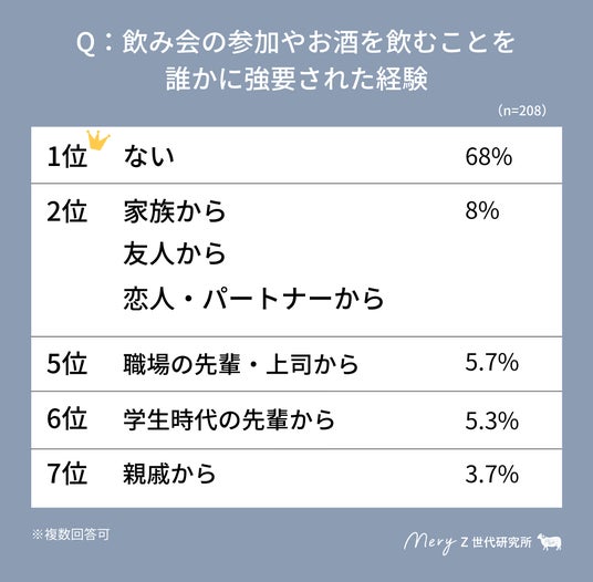 「飲み会の参加やお酒を飲むことを誰かに強要されたことがあるか」という質問では、約7割が「ない」と回答し、お酒を強要された経験がある人は、約3割という結果となった。
