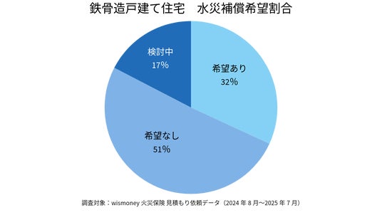調査の結果、木造住宅では「水災補償を希望する」と回答した割合が26%にとどまった一方で、鉄骨造は32%、その他構造(コンクリート造・れんが造・石造などを含む)は31%と、