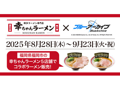 世界12カ国90店舗以上を展開、ラーメンのグローバルブランド、博多一幸舎や幸ちゃんラーメンを運営する、株式会社ウインズジャパンホールディングス(所在地 福岡県福岡市博多区、代表取締役社長 吉村 幸助 以下当社)は、福岡県内の幸ちゃんラーメン5店舗で株式会社Yostarが贈るスマートフォン向けアプリゲーム「ブルーアーカイブ」とコラボしたラーメンを2025年8月28日(木)~9月23日(火・祝)までの期間限定で販売いたします。
