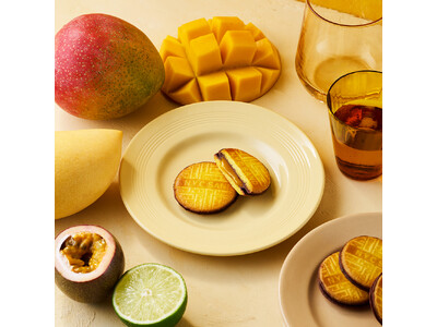マンゴーピューレ、パウダーを練り込んで香り豊かに焼き上げたクッキーで、マンゴー、パッションフルーツ、ほのかにライムを利かせて炊き上げたとろけるキャラメルとミルクチョコレートをサンドしました。