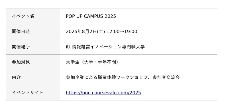 株式会社CourseVALU(本社:東京都新宿区、代表取締役:松本 和寅)は、2025年8月2日(土)に、iU 情報経営イノベーション専門職大学 墨田キャンパスにて、大学生向け職業体験イベント「POP UP CAMPUS 2025」を開催しました。本イベントは、学生と企業の相互理解を深め、採用におけるミスマッチ解消を目的に実施されたもので、今回は第2回目となる開催。低学年から参加できる新しい形の職業体験・キャリア形成の場を提供しました。