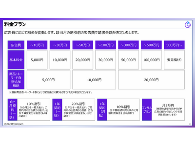 RPP広告の月額広告費に応じた料金設計となっております。(広告費は割引前の広告費が対象となります。)