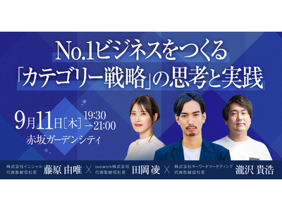 株式会社ベクトル(本社:東京都港区、代表取締役会長兼社長 CEO:西江 肇司、東証プライム:6058)の子会社である株式会社キーワードマーケティング(本社:東京都港区、代表取締役社長:瀧沢 貴浩)は、suswork株式会社(本社:兵庫県神戸市、代表取締役:田岡 凌)、株式会社イニシャル(本社:東京都港区、代表取締役:藤原 由唯)と共同で、無料オフラインイベント「No,1ビジネスをつくる『カテゴリー戦略』の思考と実践」を9月11日(木)19時半より開催いたします。