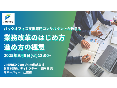 JIMUREQ Consulting株式会社(本社:東京都中央区、代表取締役:平野 涼)は、『バックオフィス支援専門コンサルタントが教える、業務改革のはじめ方・進め方の極意』セミナーを開催いたします。バックオフィス部門の方や業務改善・DXを検討されている方は必見の業務改革のはじめ方・進め方の極意をご紹介いたします。