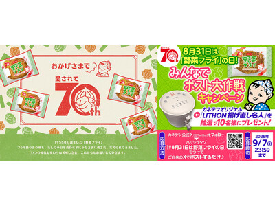 カネテツデリカフーズ株式会社(本社:兵庫県神戸市 代表取締役社長:村上 寛)が販売する“愛されて70周年を迎えたカネテツのロングセラー商品「野菜フライ」”がこのたび日本記念日協会にて8月31日は“「野菜フライ」の日”として認定されました。これを記念して「野菜フライ」の記念日である8月31日を含む応募期間中にご応募いただいた方の中から抽選で10名様に“揚げ物をおいしく温め直しができる調理家電(LITHON 揚げ直し名人)”が当たるSNS(X)キャンペーンを開催いたします。