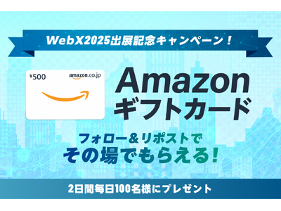 キャンペーン期間中に、当社公式Xアカウントをフォローしていただき、「2日間毎日100名様にプレゼント!WebX2025出展記念キャンペーン」投稿をリポストいただいたお客様の中から抽選で毎日100名様、累計200名様にAmazonギフトカード500円分をプレゼントいたします!