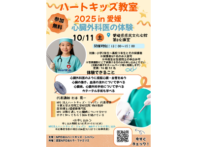 NPO法人ハートキッズ・ジャパンは、認定NPO法人ラ・ファミリエと共催で、子ども向け医療体験ワークショップ「ハートキッズ教室 2025 in 愛媛」を2025年10月11日(土)、愛媛県県民文化会館 第8会議室にて開催いたします。