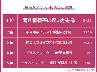 生成AIイラストに感じた問題のダントツは「著作権侵害の疑いがある(51.8%)」でした。