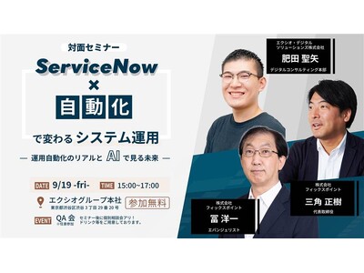 エクシオ・デジタルソリューションズ株式会社(本社:東京都港区、代表取締役社長:前田 幸一。以下「エクシオ・デジタルソリューションズ」)は、株式会社フィックスポイント(本社:東京都港区、代表取締役社長:三角 正樹。以下「フィックスポイント」)と共同で、無料共催セミナー「ServiceNow×自動化で変わるシステム運用 ~運用自動化のリアルとAIで見る未来~」を、2025年9月19日(金)15:00から開催いたします。