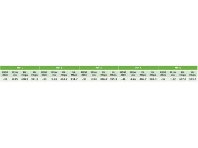 MPP(親機)から順に5カ所APを設置(MP1~MP5)して、メッシュリンクを構成し、各MPからインターネット接続を確認。各ホップ間のRSSIが高く良好な通信速度を維持できていることが確認されました。