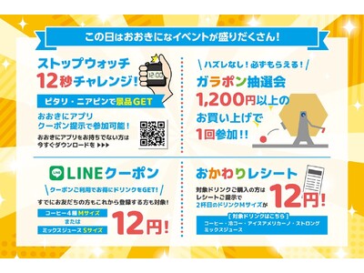おおきにアプリにて配信されたクーポン(挑戦券)を提示でチャレンジできる体感ゲーム。 ストップウォッチを「12秒ピッタリ」で止められた方には豪華景品をプレゼント! 惜しくもニアピンの方にも景品をご用意しております。
