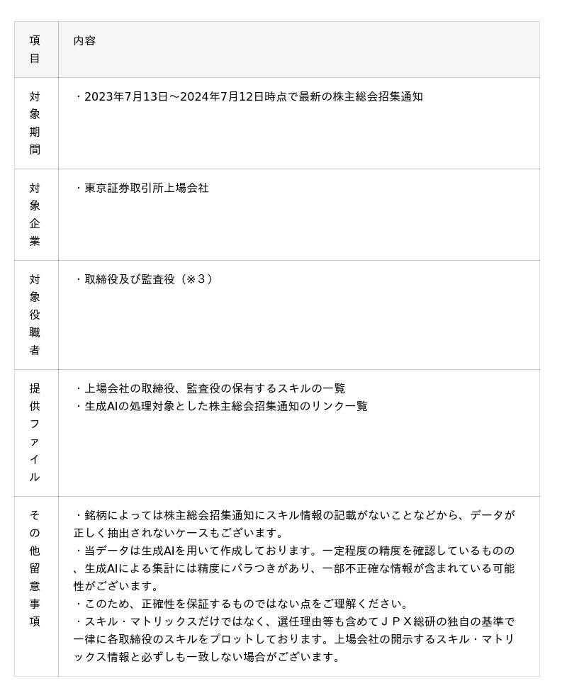 JPX総研では、上場会社各社の株主総会招集通知に記載されたスキル・マトリックスや選任理由等をもとに、生成AIを用いてスキル情報を抽出し、各取締役・監査役の保有スキルを8カテゴリ(※1)に類型化しマッピングしたデータをベータ版として作成しました。