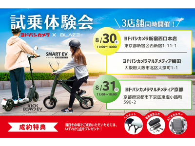 株式会社ブレイズ(愛知県名古屋市、代表取締役:市川秀幸、以下ブレイズ)は、2025年8月30日(土)・31日(日)の2日間、ヨドバシカメラ関東・関西の3店舗にて「スマートEV 特定原付モデル」「キックボードEV ライトモデル」の試乗体験会を、初めて同時開催いたします。