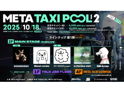 夜のタクシーに乗り合わせた二人がアバター姿でトークを繰り広げるYouTubeチャンネル『META TAXI』による音楽イベント第2弾が、10月18日(土)渋谷・WOMBにて開催決定。