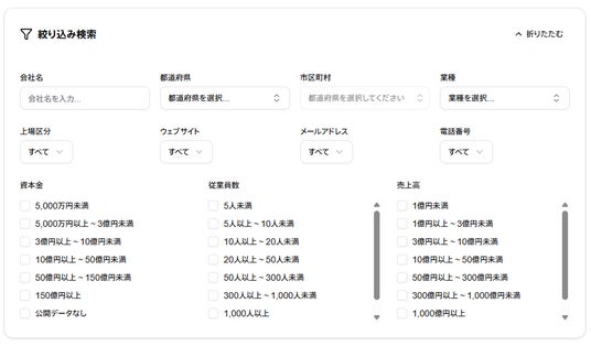絞り込み項目: 会社名 / 都道府県 / 業種(大・小)/ 上場区分 / ウェブサイト・メール・電話番号の有無