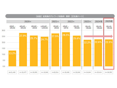 1. 2025年7月のテレワーク実施率は22.5%で、前年同期比でほぼ横ばい。テレワークは定着傾向。
