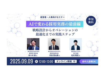 株式会社XAION DATA(本社:東京都千代田区、代表取締役:佐藤 泰秀)の運営する転職潜在層へのアプローチSaaS「AUTOHUNT(オートハント)」は、株式会社Timers(本社:東京都渋谷区、代表取締役:田和晃一郎)と株式会社ZENRYOKU(本社:東京都品川区、代表取:本図太志)との共催セミナー「AIで変わる採用実務の最前線ー戦略設計からオペレーションの最適化までの実践ステップ」を開催いたします。