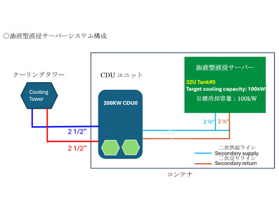 実験は、屋外型のコンテナに油液型液浸サーバーと油液の熱交換のためのユニット(CDUユニット(※参考5))を収容し、コンテナ外に設置するクーリングタワーで2次冷却する構成とします。油液型液浸サーバー内には、GPU一式(H200x8個)とダミー用ヒーター25個(全負荷(81.4kW)をセットします。
