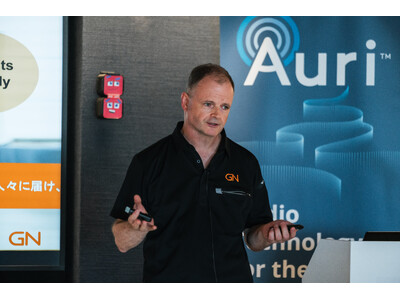 GNグループは150年の歴史を持ち、通信ケーブルの敷設から始まり、現在は補聴器、ゲーミング機器、企業向けオーディオ機器等の幅広い領域で人々をつなげています。その中でも補聴器事業はBluetooth(R)技術との深い協業に基づき、25年前に初めてBluetooth(R)をヘッドセットに搭載し、近年では2023年にBluetooth(R) LE AudioのAuracast(TM)を世界で初めて補聴器に実装した先駆者であると紹介しました。