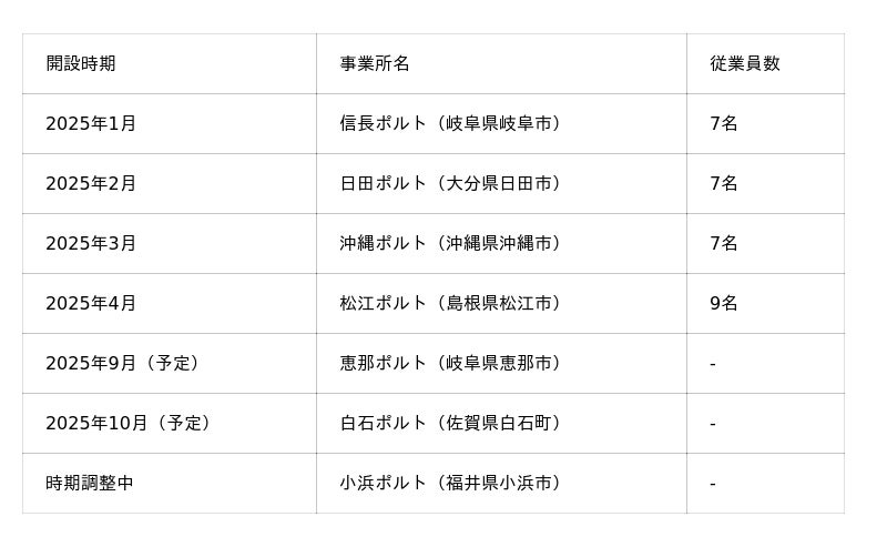 2024年10月に開設した龍馬ポルト(高知県高知市)は、従業員増加に伴う移転が決定。糸島ポルト(福岡県糸島市)も同時期の移転が決定しており、2拠点が新オフィスでの業務を9月より開始いたします。また、大村ポルト(長崎県大村市)は10月に移転リニューアルを予定しています。