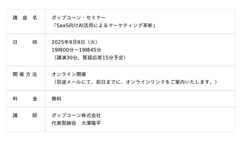 ポップコーン株式会社(所在地:東京都渋谷区千駄ヶ谷、代表取締役 大澤 陽平)は、2025年9月9日(火)19時から、代表取締役の大澤が講師を務めるポップコーン・セミナー「SaaS向けAI活用によるマーケティング革新」を無料開催します。