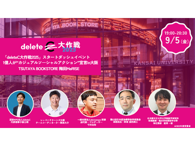認定NPO法人deleteC(デリート・シー/代表理事:小国士朗)は、全国の市民・企業団体・医療者が一体となって、がん治療研究支援とがん啓発に取り組む「deleteC大作戦2025」 を、2025年9月1日~9月30日のがん制圧月間・健康増進普及月間に全国規模で同時開催いたします。9月5日に、TSUTAYA BOOK STORE 梅田 MeRISE(大阪・大阪市)とコラボレーションし、キックオフイベントを開催します。